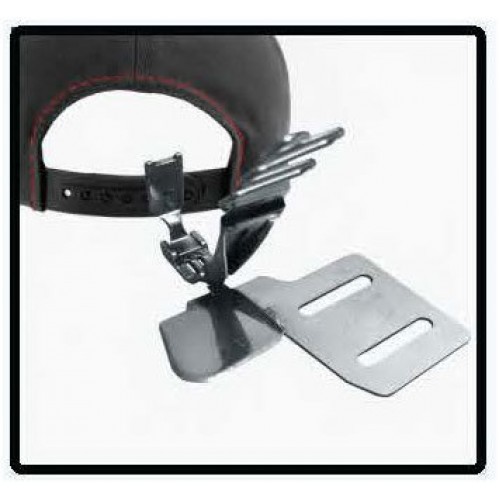 Окантователь для обработки задней арки бейсболки. Устанавливается на двухигольную машину (расстояние между иглами 6,4 мм) Подгиб задней арки края на 1/4"(6,35 мм) Обработка края задней арки бейсболки лентой - вход 3/4" (19,05мм) – выход 5/16" (7,94мм)